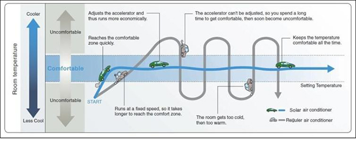 1. Solar air conditioners are variable speed/ variable tonnage air conditioners and thus operationally they are quite different from regular air conditioners that have single speed compressors and single tonnage.